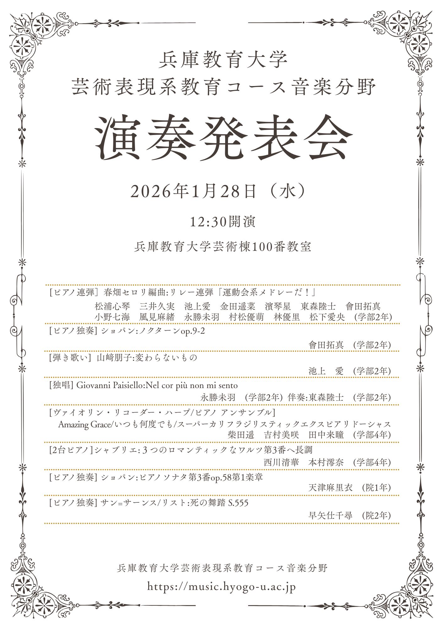 音楽グループ、音楽ゼミに所属する学部生、音楽関連授業を履修している学部生、そして音楽分野に所属する大学院生による演奏発表会を開催いたします。出演者は学部2年生から大学院2年生までの学生で、ピアノ、声楽、アンサンブルなど、さまざまな編成によるプログラムとなりました。